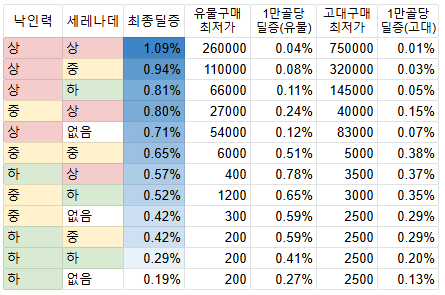 3-3) 목걸이 구매시 옵션 조합별 1만골당 딜증효과 (풍요의 랩소디 3레벨 채용기준)